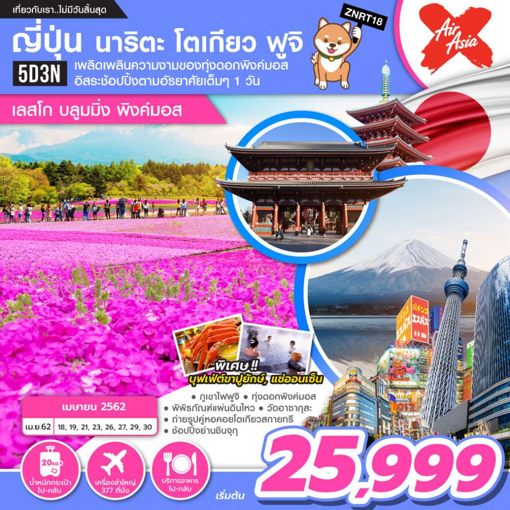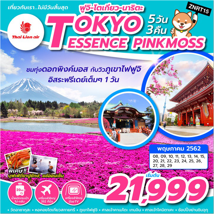 นาริตะ – วัดอาซากุสะ – ถ่ายรูปโตเกียวสกายทรี – ศาลเจ้าคาเมโดะเทนจิน - อาบน้ำแร่ธรรมชาติ ทานขาปูยักษ์ ทุ่งดอกพิงค์มอส - ภูเขาไฟฟูจิ พิพิธภัณฑ์แผ่นดินไหว – ดิวตี้ฟรี – ช้อปปิ้งชินจูกุ ดิสนีย์แลนด์ อิสระเลือกช้อปปิ้งเต็มวัน