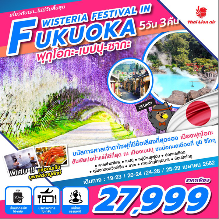 ฟุกุโอกะ ศาลเจ้าดาไซฟุ เบปปุ หมู่บ้านยูฟูอิน บ่อทะเลเดือดจิโกกุ เมกุริ บุฟเฟ่ต์ขาปูยักษ์ แช่ออนเซ็น อุโมงค์ดอกวิสทีเรีย ซากะ ศาลเจ้ายูโทคุอินาริ ช้อปปิ้งโทซุ พรีเมี่ยม เอาท์เล็ต ฟุคุโอกะ