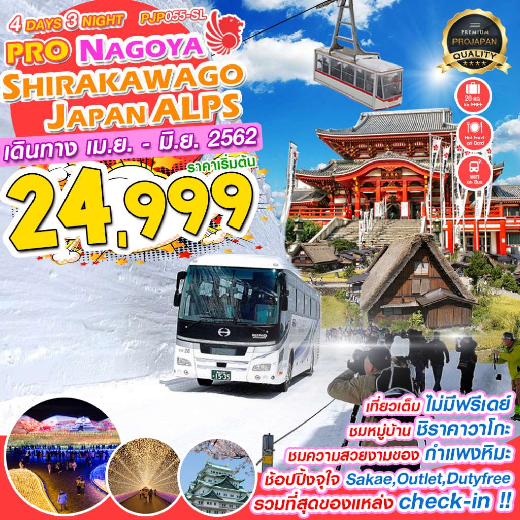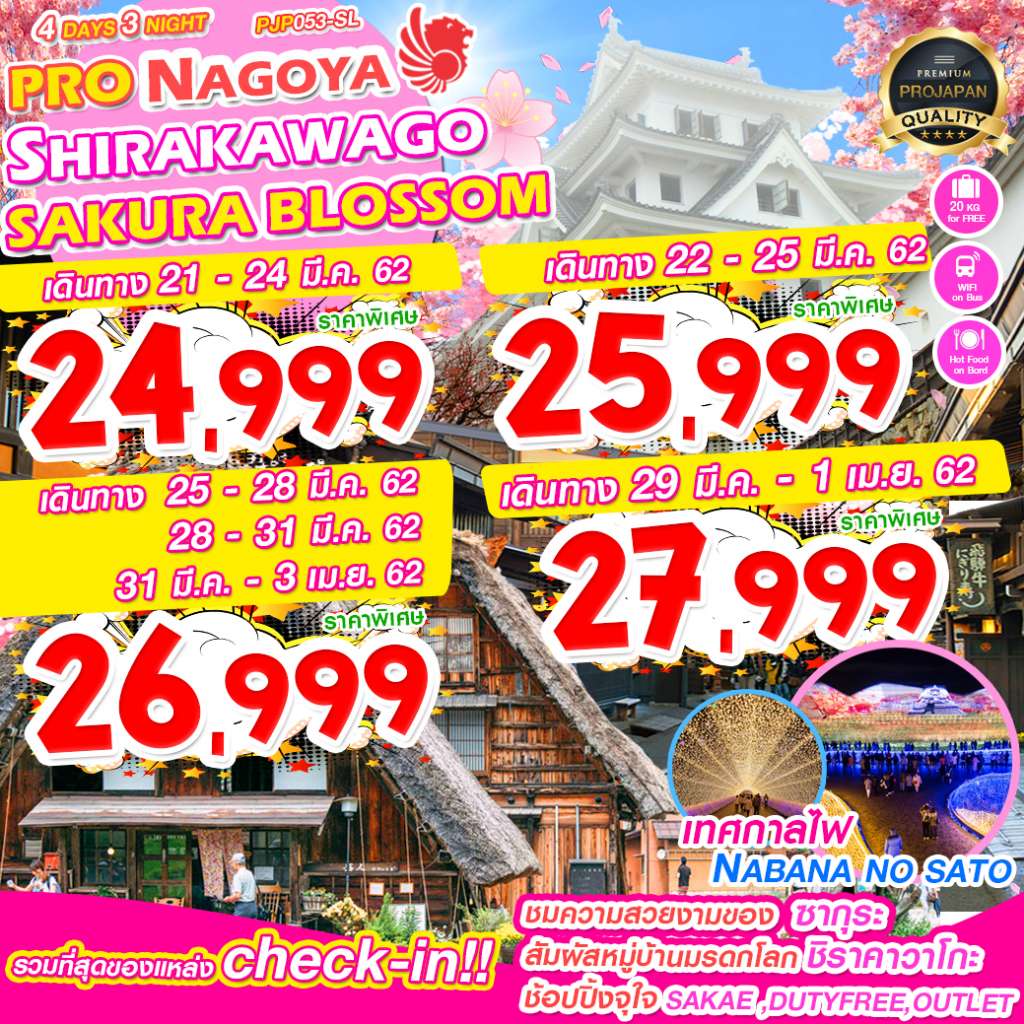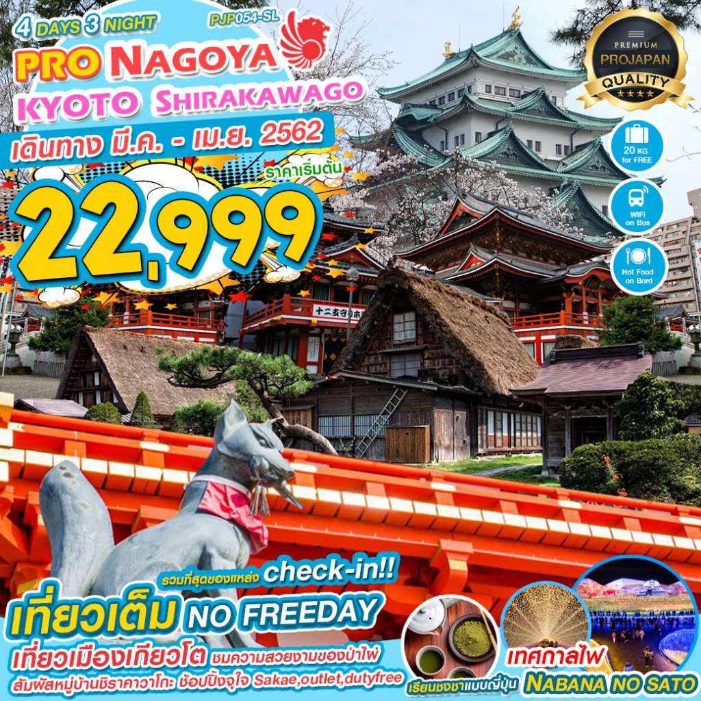 บินตรงลงนาโกย่า ด้วยสายการบิน THAI LION AIR ไม่ต้องนั่งรถไกล ฟรี!อาหารร้อนบนเครื่องและน้ำหนักกระเป๋า 20 กิโลกรัมต่อท่าน,เยือนเมืองนาโกย่า,ถ่ายรูปที่MEIJO PARK,ศาลเจ้าโอสึคันนง,ทาคายาม่าจินยะ,ซันมาชิซูจิ,หมู่บ้านมรดกโลก..ชิราคาวาโกะ,ชมความสวยงามของซากุระ