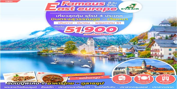 เที่ยวสุดคุ้ม ยุโรป 4 ประเทศ บินตรง สุวรรณภูมิ-เวียนนา ชิมเมนูพิเศษ อาหารไทย+กูลาซซุป ล่องเรือชมความงาม "แม่น้ำดานูบ" พระราชวังเชินบรุนน์ ,ฮัลล์สตัทท์ ,กรุงบราติสลาวา, โบสถ์เซนต์สตีเฟ่นส์ ,ปราสาทครุมลอฟ ,ปราสาทแห่งปราก ![]() ![]() ![]() ![]() ![]() ![]() ![]() ![]() |